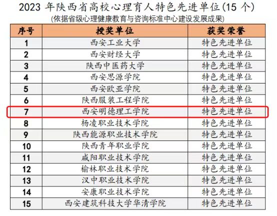近日,陕西省高校心理素质教育研究会对2023年度陕西省高校心理育人相关工作进行表彰,学校喜获佳绩。学校荣获2023 年陕西省高校心理育人“特色先进单位”称号。党委学生工作部副部长童杨梓荣获“最支持心理工作好部...