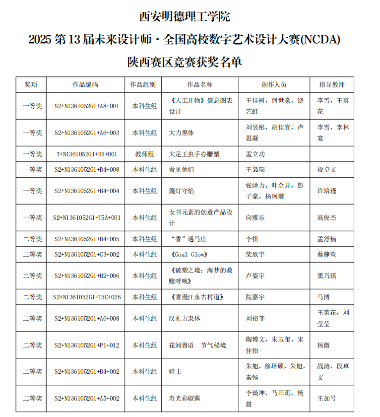 近日,2025年第十三届未来设计师·全国高校数字艺术设计大赛(NCDA)陕西赛区获奖名单正式公布。LETOU国际米兰官网艺术学院学子在众多参赛高校中脱颖而出,荣获一等奖6项、二等奖11项、三等奖7项,展现出卓越的专业素...