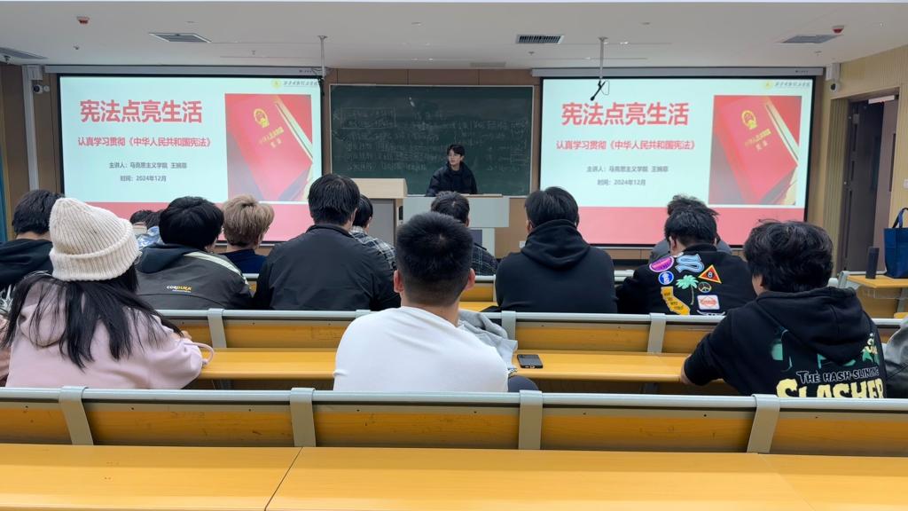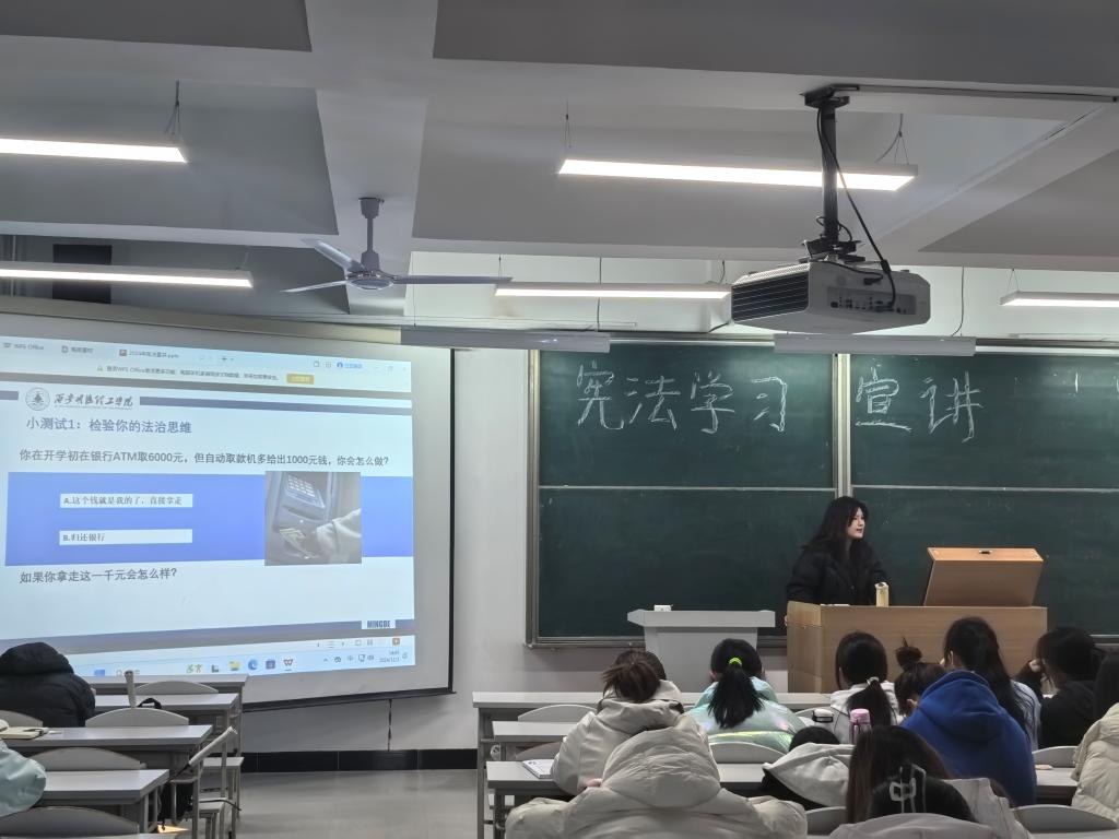 马克思主义学院教师王婉菲走进信息工程学院,以“宪法点亮生活”为题为学生开展了一场别开生面的宪法宣讲。王老师从宪法的地位与作用谈起,深入浅出地阐述了宪法作为国家根本大法的重要性,以及它与每个人日常生活的紧密联系,并通过生动的案例分析、互动问答,学生们深刻感受到了宪法在保障公民权利、维护社会稳定中的关键作用,进一步增强了宪法意识和法治观念。