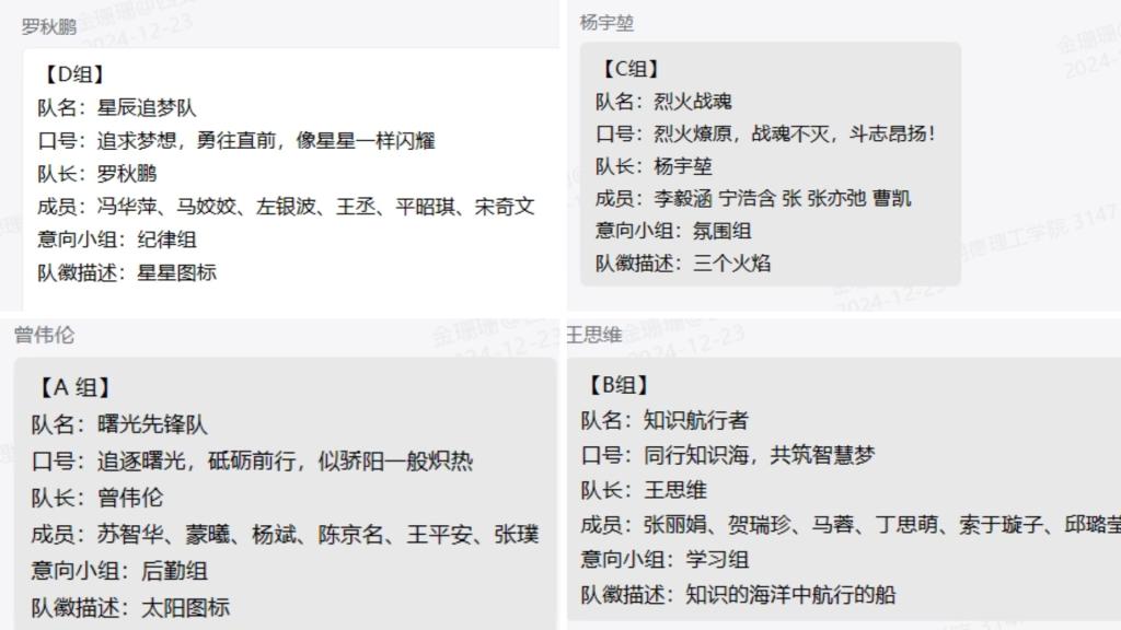前置测温:项目开始前,班主任将学员分为4组,组建班委。通过组长责任制搭建学习小组,各小组在培训开始前积极讨论,共同制定了小组口号、队徽,并完成了团队组建与群内自我介绍的展示环节,充分展现了团队的合作精神与创造力。