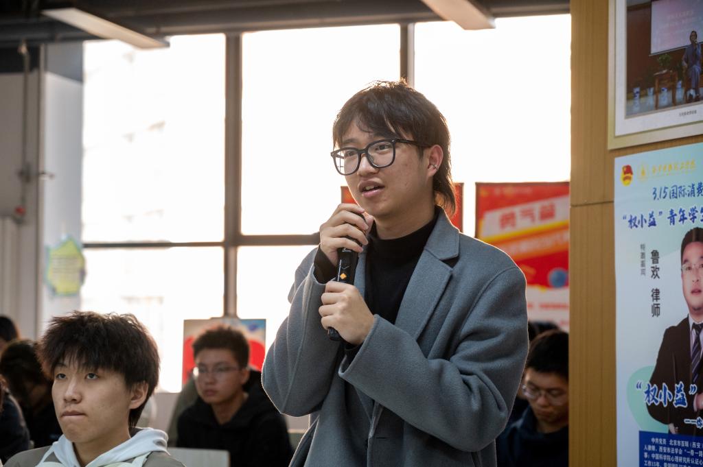 互动破冰,从生活痛点切入法律。活动以“有问必答”趣味互动开场,鲁欢律师抛出问题:“你是否遇到过消费憋屈事?如何处理?”学生纷纷分享网购纠纷、霸王条款等经历。结合《中华人民共和国消费者权益保护法》,鲁律师引导学生聚焦知情权、选择权、公平交易权等核心权益,强调“法律是解决问题的第一工具”。