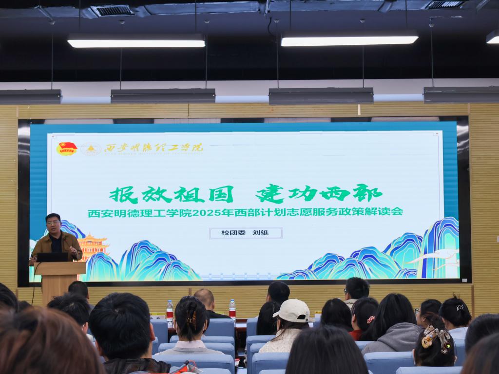 政策引领方向,青春响应号召。会议以“报效祖国 建功西部”为主题,通过政策宣讲、榜样分享、动员答疑等环节,全方位解读西部计划的服务内容、政策保障及报名流程,号召青年学子以奋斗之姿奔赴西部基层,在祖国最需要的地方绽放青春光彩。校团委书记童杨梓在动员讲话中表示:“西部计划是青年学子践行家国情怀的重要平台,希望同学们勇担时代使命,将个人成长融入国家发展大局,用知识和热情为西部建设贡献力量。”