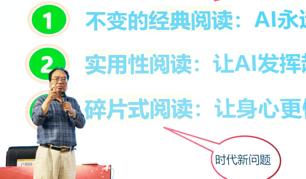 讲座伊始,卢教授从伟大领袖毛主席、习近平总书记、大文豪鲁迅先生谈读书为例引出为什么要读书?什么是经典?为什么要读经典?怎样读经典?层层深入展开阐述。通过“实用性阅读”和“经典阅读”的比较,卢教授提出阅读经典是成就理想人格的重要途径,经典文本犹如一座蕴藏着无尽智慧的宝库,常读常新、历久弥新;阅读经典时带来的独特心流体验,AI无法复制,更无法共情。