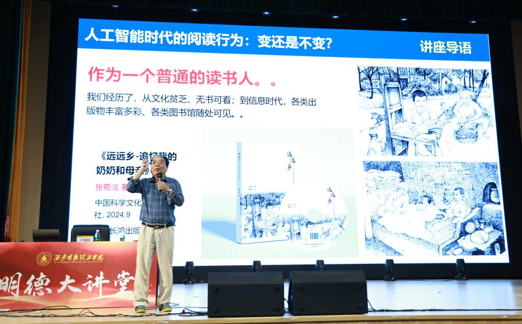 为全面推进校园阅读文化氛围营建,助力“学在明德”品牌内涵共建, 图书馆联合马克思主义学院、党委组织宣传部、党委学生工作部,于5月21日下午,特邀西安电子科技大学通信工程学院教授、博士生导师卢朝阳,在四季廊桥报告厅开展《人工智能时代的阅读之思:变与不变?》主题讲座。本次讲座由图书馆副馆长强丽丽主持,1100余名师生齐聚一堂,共同探讨技术变革中阅读行为的坚守与革新。该活动是2025年“科技明德·共读未来”阅读文化节系列活动之一。