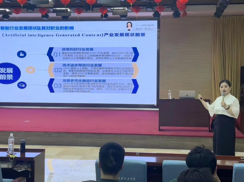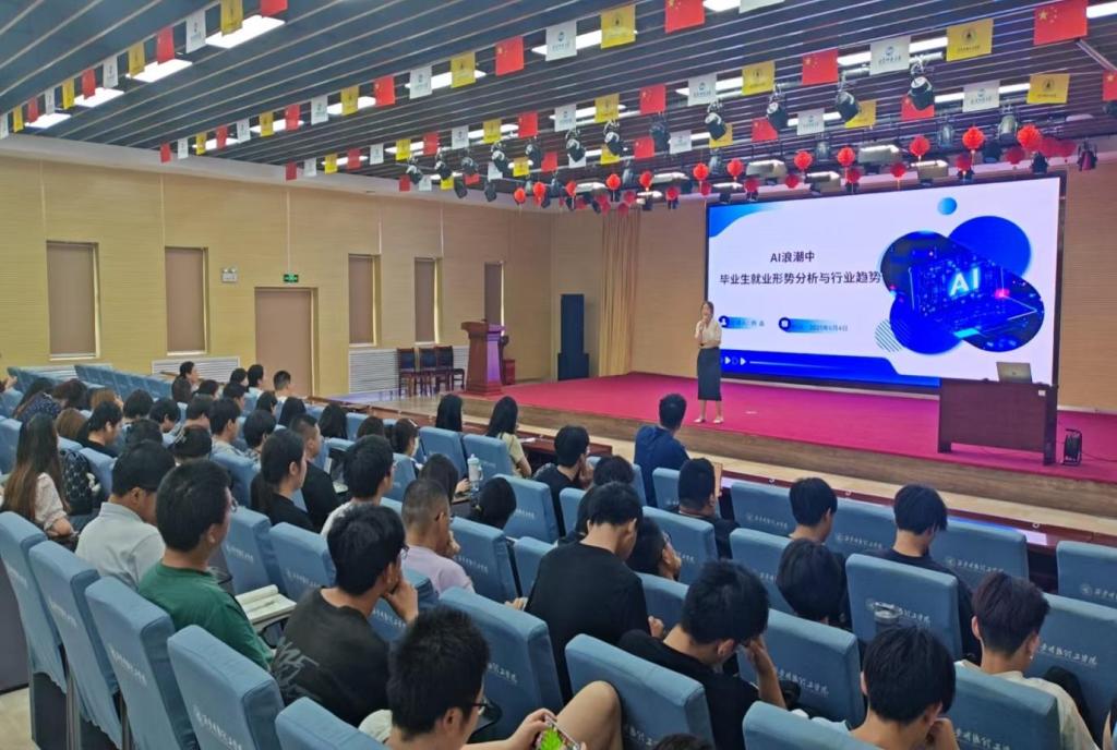 在“AI浪潮中毕业生就业形势分析与行业趋向风向标”与“AI对大学生就业的影响及理性应对”的讲座中,罗晓婷与杨晶老师结合专业知识与实践经验,为学生带来深度分享。她们剖析了AI技术对传统行业的冲击与颠覆,列举制造业、服务业、金融业等领域的岗位变化案例,说明AI如何催生新职业,同时改变岗位技能需求。结合政策导向与市场数据,老师们指出AI+医疗、智能驾驶、工业互联网、绿色能源等领域的人才缺口,分析“技术+行业”复合型人才的竞争优势,建议毕业生关注细分赛道的发展机遇。针对AI浪潮下的求职挑战,强调“软硬技能结合”的重要性——既要掌握AI工具应用、数据分析等硬技能,也要提升创新思维、跨领域协作等软实力,鼓励毕业生打破专业限制,通过实习、项目实践积累AI相关经验。