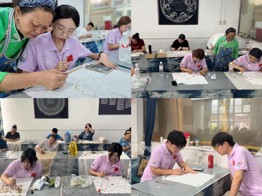 期间,同学们体验了蜡染工艺,靛蓝布料与蜡香环绕间,大家分组创作方巾,或借鉴丹寨少数民族曲线图案,或绘苗族经典蝴蝶纹,更有队员融入校徽元素进行设计。看到自己亲手制作的蜡染作品呈现眼前,同学们脸上充满成就感。这场体验不仅是技艺的学习,更是与民族文化的深度对话,让大家真切感受到蜡染背后的匠心,也让苗乡蜡韵在实践中愈发鲜活。
