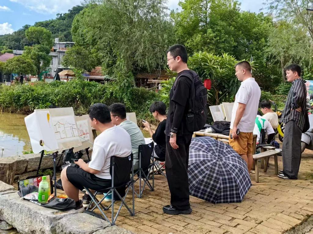 勾蓝瑶寨历史悠久,距今已有800 余年,拥有独特的瑶族建筑风格与淳朴的民俗风情。这里山水相依,青瓦石墙、木窗雕花的古建错落有致,充满了古朴的韵味,为艺术创作提供了丰富的素材与灵感源泉。抵达写生基地后,师生们迅速投入到紧张而充实的课程中。清晨,学生们迎着朝阳,分散在瑶寨的各个角落,支起画板,将眼前的美景用画笔描绘下来。无论是层叠的山峦、蜿蜒的水系,还是飞檐翘角的亭台楼阁、红砖青瓦的明清民居,都成为了他们画布上的主角。在绘画过程中,专业教师们穿梭于学生之间,耐心地进行指导,从构图、色彩搭配到笔触运用,为学生们答疑解惑,帮助他们更好地捕捉自然之美,提升绘画技巧。