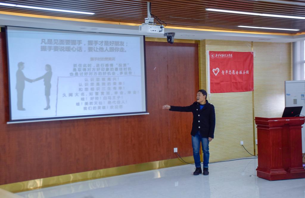培训会以如何做好志愿服务组织和管理为出发点,由团委乔建老师担任主讲,从第十四届全国运动会、全国第十一届残运会基本常识、志愿者通用政策解读、残疾人服务培训、礼仪形象训练等方面进行培训。并结合自身经验,分享了自己在各类志愿活动中的心得体会,通过与现场志愿者游戏互动清晰详尽地讲解应急处突、医疗救护基本知识,并配合助教示范,生动形象地向志愿者们展示了如何应对各类突发事件,保障各项赛事顺利平稳运行。