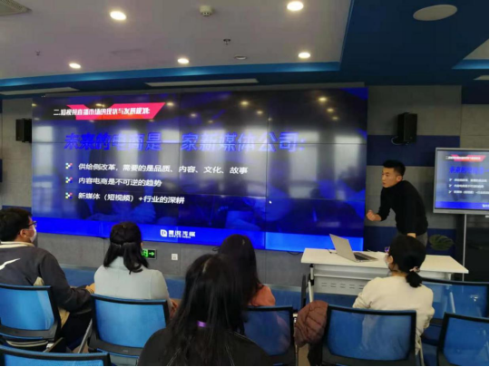 随后,大家参观了京东航天直播基地,基地负责人高经理对直播间布局、演播流程等进行了详细介绍。通过参观网络直播间,学生们加深了对网络直播的认识。高经理还向大家详细地介绍了电商带来的影响力、校园直播在全国的普及情况、电商领域的优势等等。同时,高经理表示欢迎对电商直播感兴趣的同学,前往京东航天直播基地深入学习。