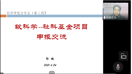 4月24日19:45—21:30经济与管理学院在腾讯会议召开了“第二期科学研究分享会”,经济与管理学院全体教职工教师参加了线上分享会。本期分享的主题是“软科学—社科基金项目申报交流”,郭鹏院长就多年的研究领域和研究经验工作做了分享。