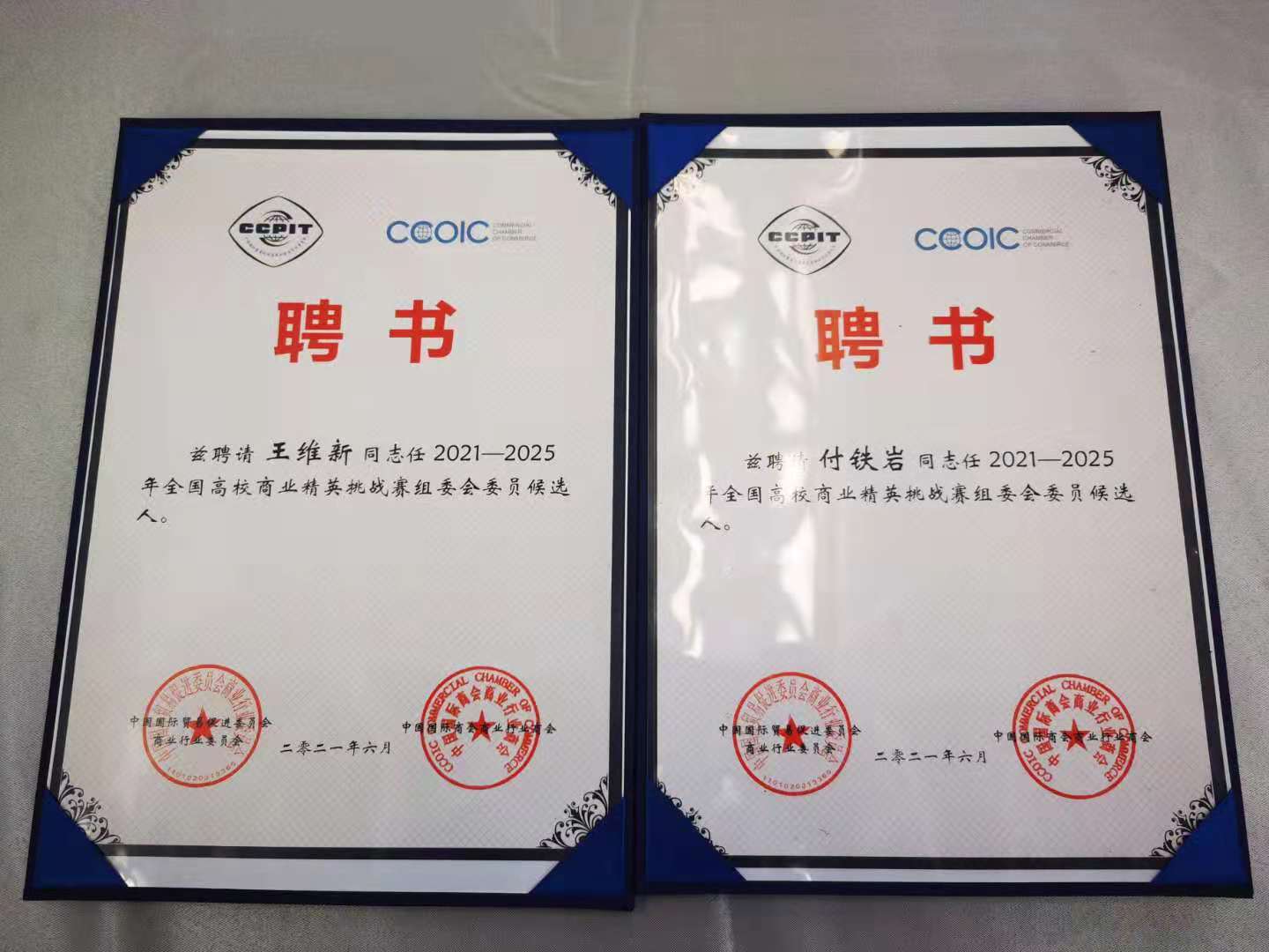 2021年6月9日,在天津召开的全国商科精英挑战赛表彰活动中,我院国际经济与贸易专业三名教师——余露露、解蕾、王维新获得“商科教育学科竞赛优秀工作者”称号。同时,聘请付铁岩、王维新为“全国商业精英挑战赛组委会委员候选人”。