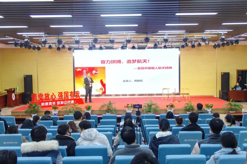 11月30日下午,“请党放心强国有我”第六季明德青年•信仰公开课第二讲于建德楼203报告厅举行。学校2016届机械设计制造及其自动化毕业生、神舟载人飞船系列中继测控天线总装工艺工程师周君权主讲,青年马克思主义者培训班、大学生骨干培训班学员以及各二级学院学生代表参加了本次活动。