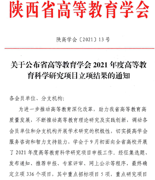 12月6日,陕西省高等教育学会发布《关于公布省高等教育学会2021年度高等教育科学研究项目立项结果的通知》陕高学会〔2021〕13号,LETOU官网立项四项课题,全部由经济与管理学院教师主持或参与。