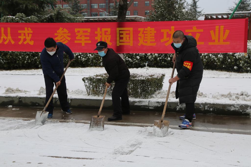 由于人员众多,校内除雪工具不足,大家轮番上阵,经过2个多小时的奋战,圆满完成积雪清除工作,为师生们开辟出了一条条温情的道路。