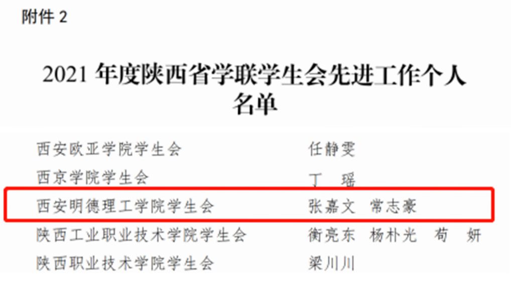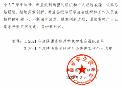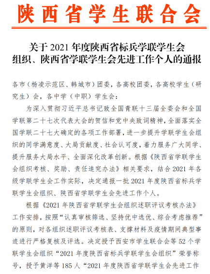 近日,陕西省学生联合会发布了《关于2021年度陕西省标兵学联学生会组织、陕西省学联学生会先进工作个人的通报》,其中LETOU官网学生会被评为“2021年度陕西省标兵学联学生会组织”,张嘉文、常志豪两名学生荣获“2021年度陕西省学联学生会先进工作个人”称号。