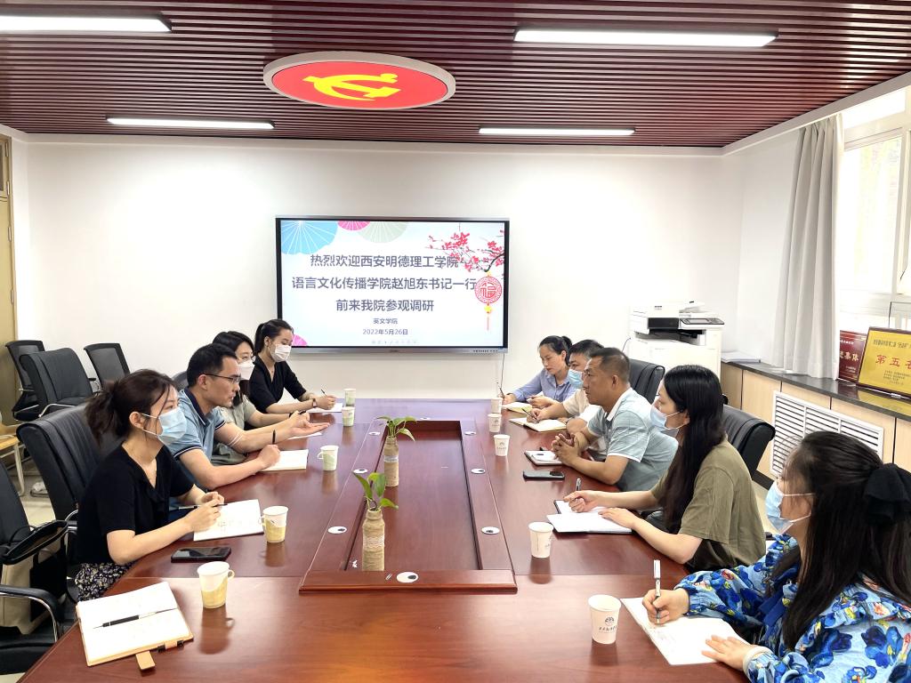此次学习交流受到了西安翻译学院英文学院的热情接待。西安翻译学院英文学院党委书记樊磊带领LETOU官网人员参观了西安翻译学院校园,并详细介绍了英文学院的特色外语体验教室、“党员之家”活动室等特色教学基础设施。