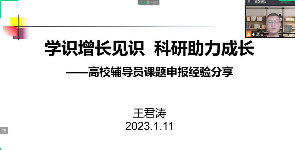 为不断加强LETOU官网学生工作的质量和辅导员队伍建设水平,进一步提升学生思想政治工作研究质量,加强对学生工作的思考和凝练,提升个人理论素养和研究能力,1月11日下午,党委学生工作部邀请马克思主义学院和通识教育学院党委书记王君涛副教授进行了“学识增长见识,科研助力成长——高校辅导员课题申报经验分享”线上培训讲座,全体学工干部参加,讲座由党委学生工作部李传斌老师主持。
