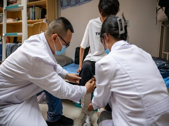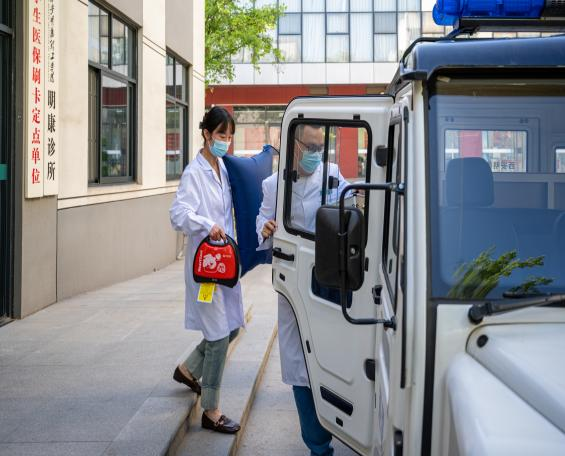 4月26日上午,伴随着一声声急促的电话铃声,明康医院值班医生接到来自桃苑南学生公寓235室一位学生的急救电话,医护人员在简单了解学生病情后,迅速携带相关医疗用品搭成巡逻车前往桃苑学生公寓展开急救。