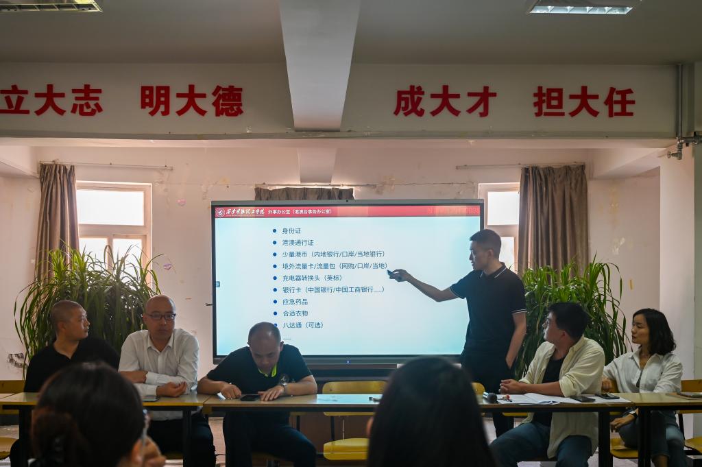 校团委副书记刘雄就交流营的出行、住宿、餐饮、分组、保险、节目等工作向与会师生做了详细介绍及系统的部署。马克思主义学院李维维老师向大家介绍了本次交流营课程安排及要求。外事办公室何勃毅老师就行前准备、出入境须知、当地注意事项向同学们进行了详细的讲解,叮嘱同学们赴港后要与各地青年代表相互尊重,友好交流,充分讲好明德故事,讲好家乡故事,讲好中国故事。智慧安全警务处宋敏纲处长强调,开展行前安全教育会是青年梦想家交流活动的重要一环,对出境赴港人员严守外事纪律,增强安全防范意识和危机处理能力具有重要意义。宋处长说到,所有师生都要从外事纪律、安全保密、知行礼仪等方面自觉增强政治意识,切实提高思想认识,坚守政治信仰、站稳政治立场、把准政治方向,同时要认真遵守香港有关法律法规,尊重当地的风俗习惯,注意人身财产安全,明确交流目的任务,圆满完成交流任务。