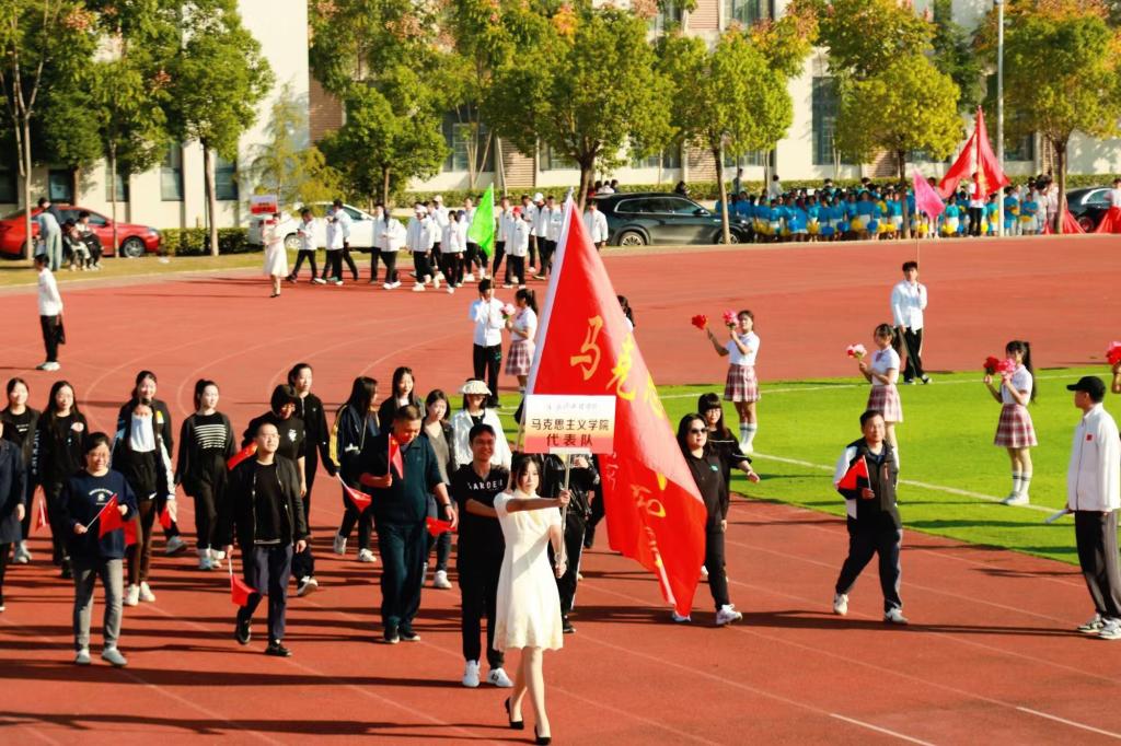 开幕式正式开始,伴随着铿锵有力的运动员进行曲,马克思主义学院方队入场,方队步伐整齐,口号嘹亮,充分展现了运动员团结一致,奋勇拼搏,勇往直前的昂扬斗志。
