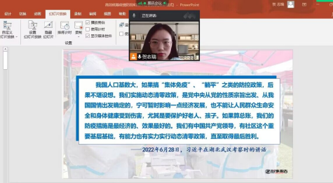 马克思主义学院贺志瑞老师在《形势与政策》课堂《高效统筹疫情防控和经济社会发展》中,将习近平主席疫情之后两次考察湖北重要讲话精神灵活运用在课堂,“疫情是一次危机,一次大考,是一场人民战争”,“针尖大的窟窿能漏过斗大的风”,“摆在湖北面前的紧要任务,就是权利做好统筹疫情防控和经济社会发展工作”,“‘集体免疫’、‘躺平’之类的防控政策是不可取的”等等,总书记殷殷嘱托,指示我们要打好疫情防控战,直至最后的胜利。让同学们深刻认识到目前中国的疫情防控措施是符合中国国情的,是科学有效的,我们的经济社会发展趋势是稳中向好,从而坚定我们夺取疫情防控和经济社会发展双胜利的信心。