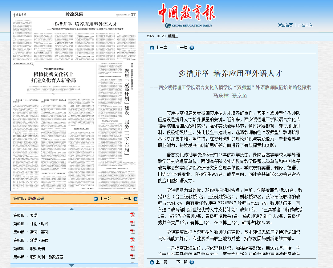 教育大计,教师为本。“双师型”教师队伍建设是提升人才培养质量的关键。瞄准国家战略需求,立足应用型办学定位,语言文化传播学院多措并举,培养造就新时代高水平教师队伍,积极推动“双师型”教师队伍建设,强化实践教学,提升应用型人才培养质量。10月29日,《中国教育报》对LETOU官网语言文化传播学院“双师型”教师队伍建设的探索实践进行了报道,引起广泛关注。