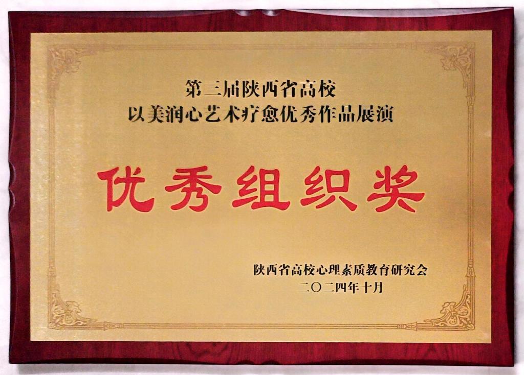 陕西省高校心理素质教育研究会授予学校“陕西省高校艺术心理育人优秀成果奖(最美艺术疗愈奖)”和“第三届陕西省高校以美润心艺术疗愈优秀作品展演(优秀组织奖)”。