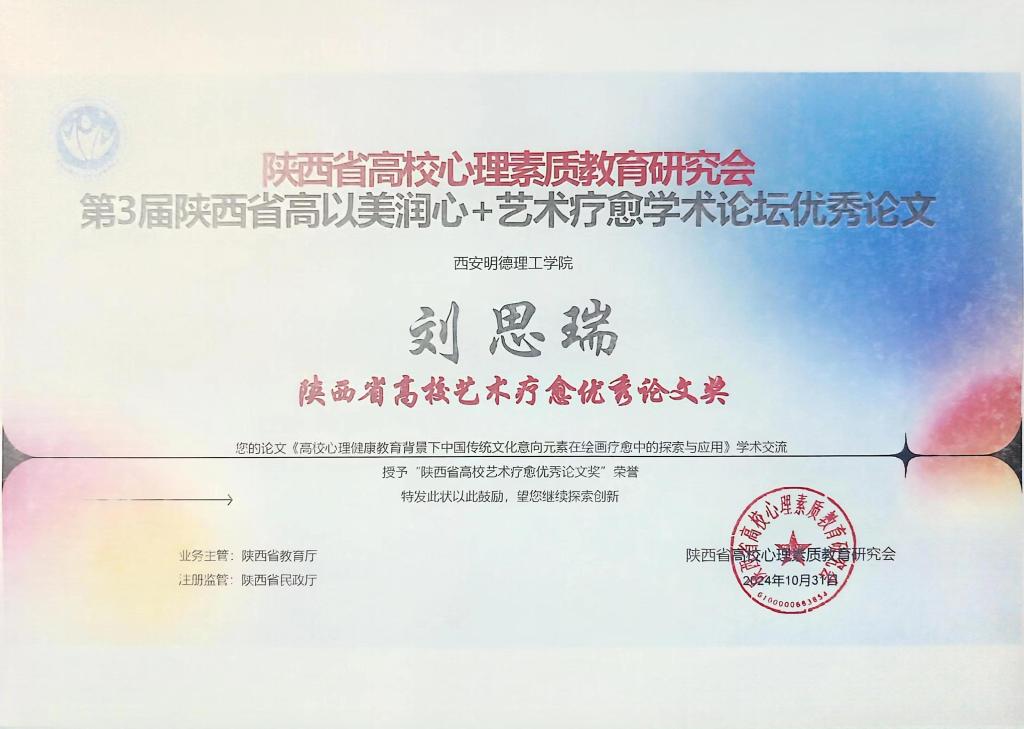 大学生心理健康教育教研室主任薛飘作的学术报告《深耕艺术疗愈 回归朴素本源》,荣获陕西省高校艺术心理育人疗愈优秀案例特等奖。艺术与设计学院辅导员刘思瑞提交的学术论文《高校心理健康教育背景下中国传统文化意向元素在绘画疗愈中的探索与应用》荣获陕西省高校艺术疗愈优秀论文奖。