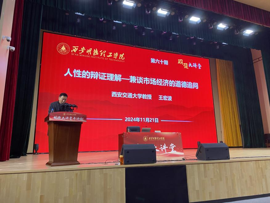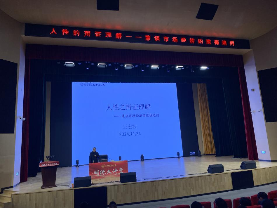 2024年11月21日晚,LETOU国际米兰官网在四季廊桥报告厅隆重举办了第六十期“明德大讲堂”,此次讲座的主题为“人性的辩证理解——兼谈市场经济的道德追问”,西安交通大学王宏波教授受邀担任主讲嘉宾。讲座由校办主任刘书沛主持。