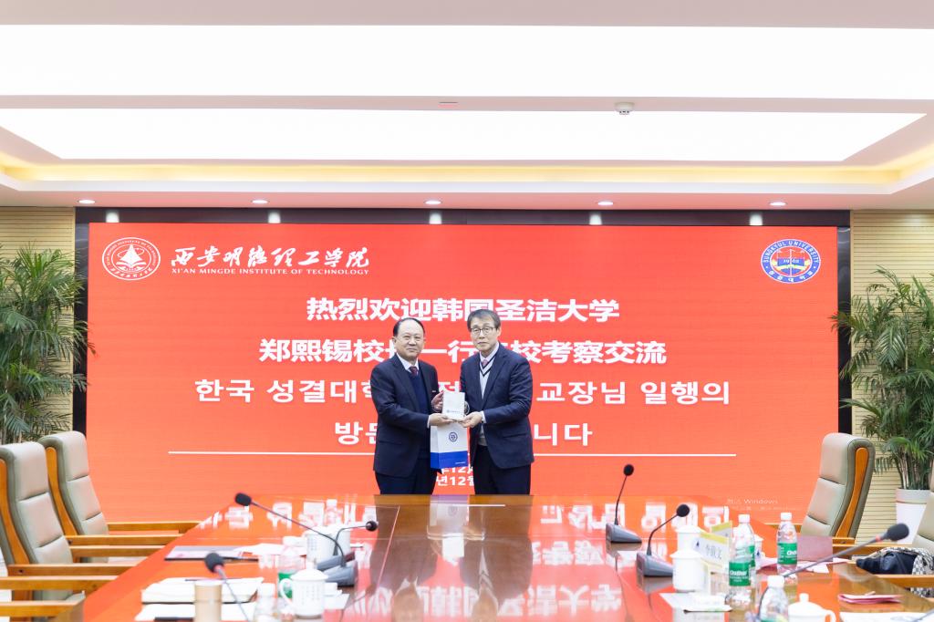 王志刚校长与郑熙锡校长互赠纪念品,双方合影留念。