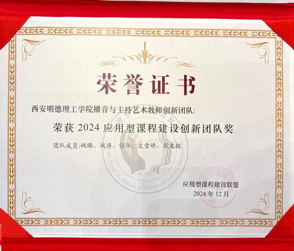 为落实立德树人的根本任务,深化应用型院校课程改革,教育部学校规划建设发展中心近日在深圳举办了“应用型课程建设联盟2024年年会论坛”。来自全国各地近200所高校、共计300余位代表齐聚一堂,共同探索应用型课程建设与改革的新路径、新方法。学校教务处遴选并推荐教师团队参加联盟应用型课程建设创新团队奖的评选活动。经联盟专家评审,学校播音与主持艺术教师创新团队凭借其在应用型课程建设方面探索与收获,荣获了“2024应用型课程建设创新团队奖”。