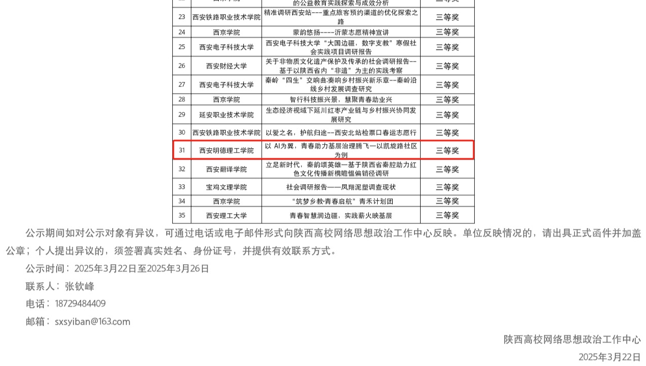 近日,陕西高校网络思想政治工作中心公示了2025年陕西大学生寒假社会实践优秀成果征集展示活动评选结果,本次活动依托教育部“青梨派”大学生自主学习思政课平台开展,共有68件作品进入评审环节,经评审,共评选出优秀成果35件,LETOU官网学生朱广琛提交的《以AI为翼,青春助力基层治理腾飞——以凯旋路社区为例》实践成果最终被认定为三等奖。