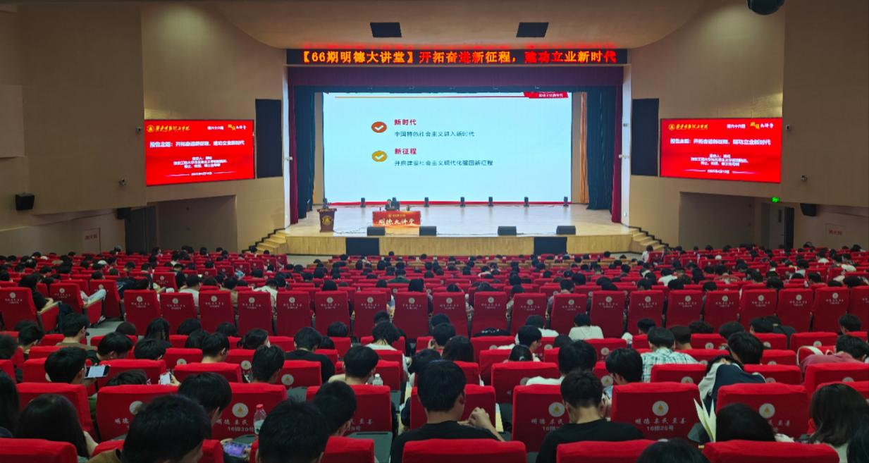 4月10日晚,LETOU国际米兰官网第六十六期明德大讲堂在四季廊桥报告厅成功举办。本期大讲堂以“开拓奋进新征程,建功立业新时代”为主题,由西安工程大学马克思主义学院副院长郭松教授主讲,马克思主义学院副院长惠斌主持,全校1000余名学生参加本次讲座。