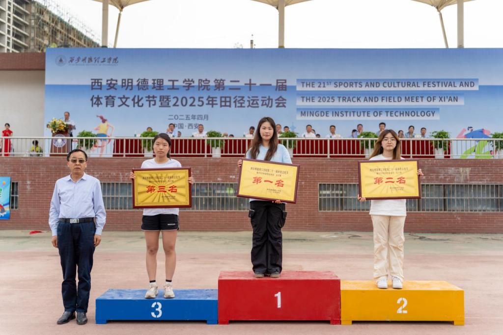 校党委副书记、纪委书记白秦川为获得女子团体第一名的信息工程学院,第二名的明德科技职业学院,第三名的语言文化传播学院颁奖。