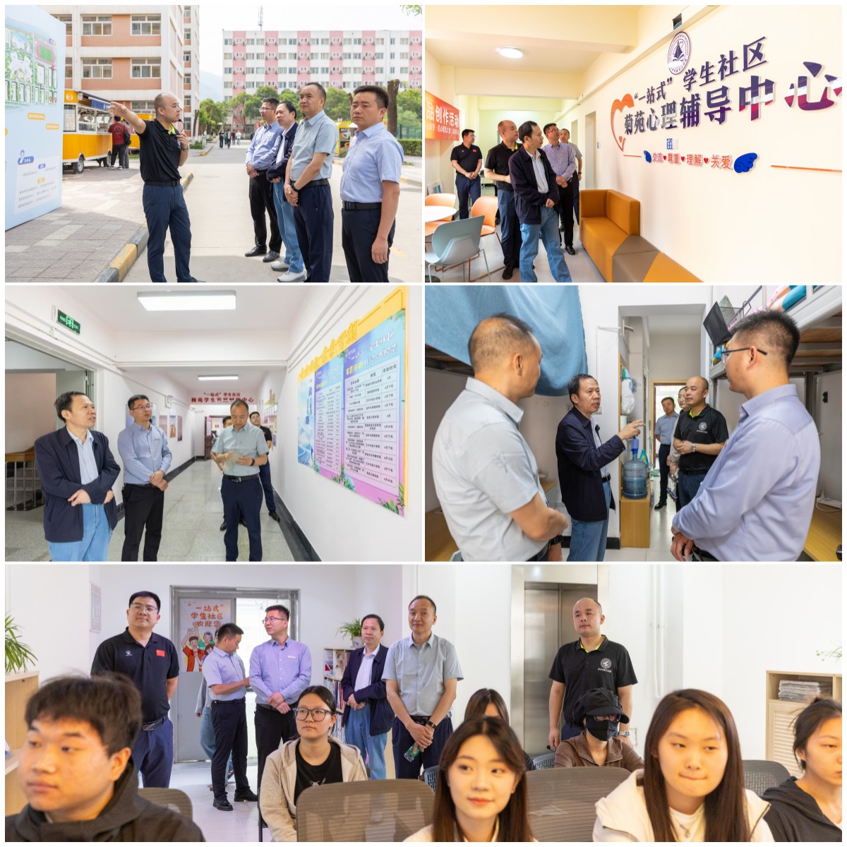 专家组一行先后实地走访“一站式”学生社区百合楼党团活动中心、菊苑就业指导中心、菊苑心理辅导中心、竹苑党建示范引领中心、梅苑学生发展赋能中心等地。在随后举行的专题座谈会上,专家组查阅“一站式”学生社区综合管理模式相关建设情况资料,并就建设中的党建引领、学风建设、后勤保障、力量下沉、数字应用等情况进行了细致问询。