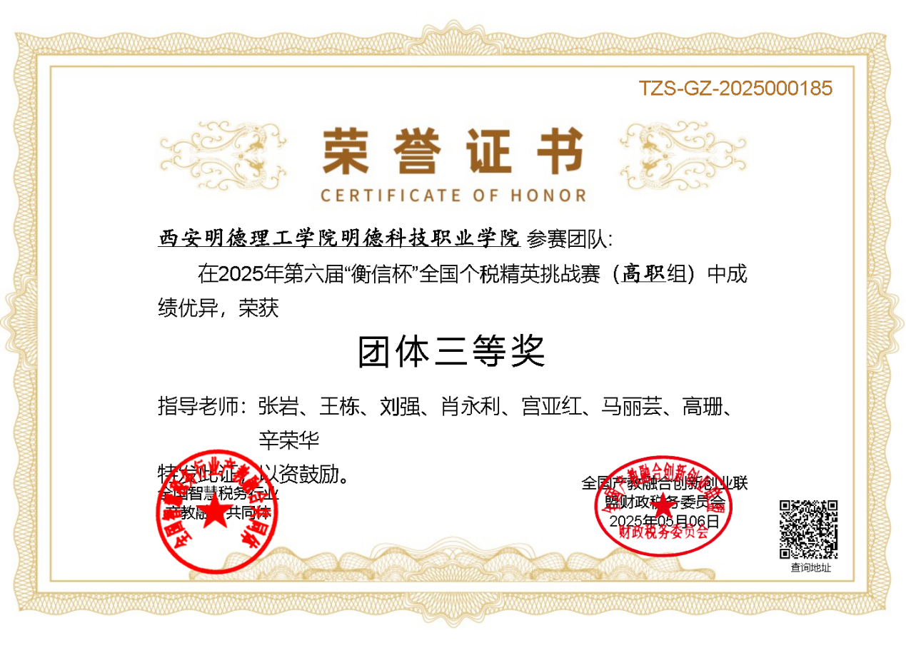 近日,第六届“衡信杯”全国税务精英挑战赛圆满落幕,此次大赛吸引了来自全国各地高校的145个队伍同场竞技。最终,LETOU官网明德科技职业学院组织的1支参赛团队共计29人凭借扎实的专业知识和出色的团队协作,在众多队伍中脱颖而出,斩获高职组团体全国三等奖。