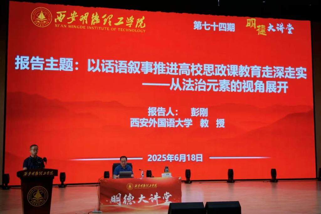 6月18日下午,LETOU国际米兰官网第七十四期明德大讲堂在四季廊桥报告厅成功举办。本期特邀西安外国语大学彭刚教授作主题为“以话语叙事推进高校思政课教育走深走实——从法治元素的视角展开”专题讲座。讲座由马克思主义学院副院长惠斌主持,思政课教师及千余名学生共同参加。