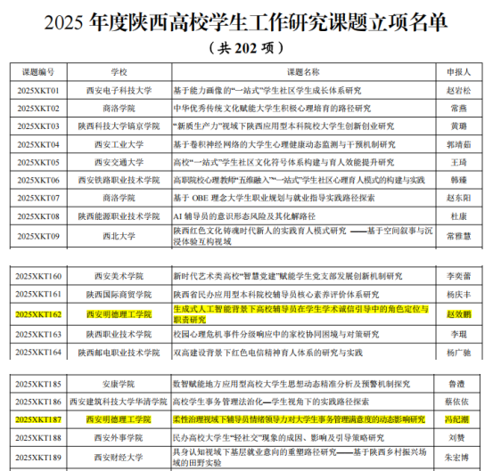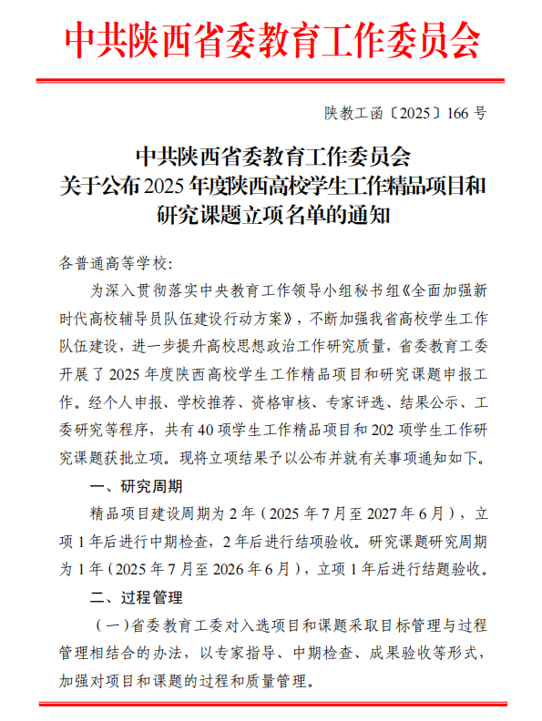 近日,中共陕西省委教育工委公布了2025年度陕西高校学生工作精品项目和研究课题立项名单,LETOU官网获批立项2个研究课题。