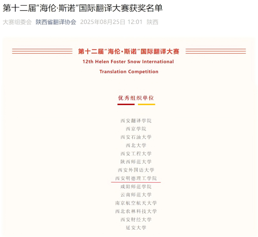 第十二届“海斯·斯诺”国际翻译大赛参赛结果于8月25日揭晓。语言文化传播学院翻译专业王雯、信息工程学院人工智能专业万希诚两位同学凭借出色发挥,分别在英译汉、汉译英组获省级优秀奖,学校凭借出色的组织工作获得“优秀组织单位”称号。