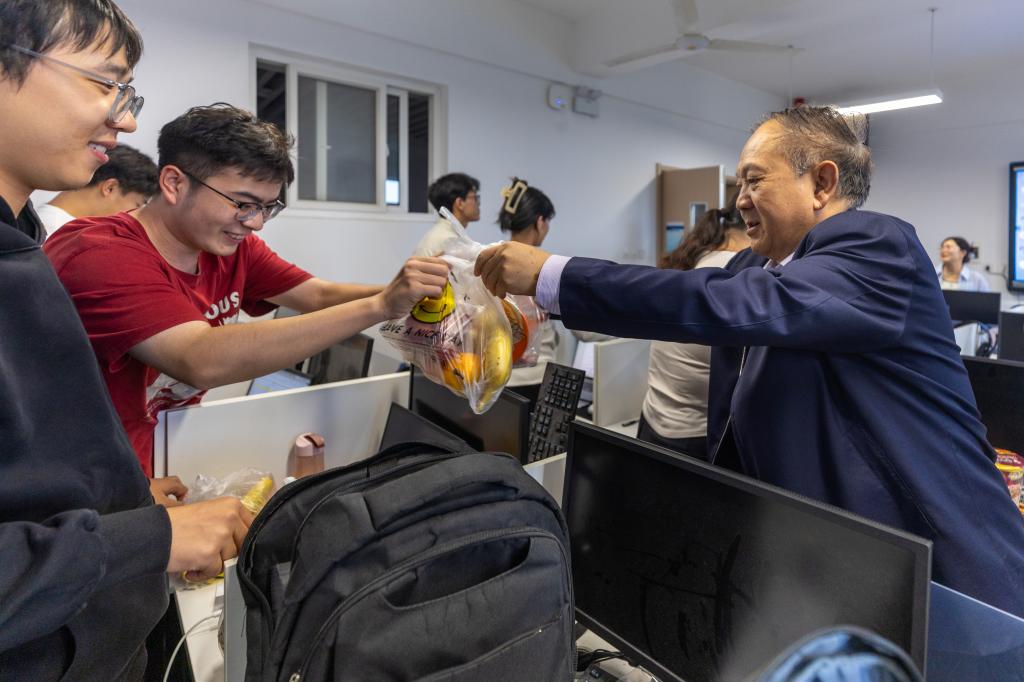 本次竞赛受到学校领导的高度重视。9月5日下午3点,校长王志刚、党委书记马川鑫、副校长林东、副校长刘星专程来到竞赛现场开展慰问工作,为大家送上水果等慰问品。在与学子的交流中,王志刚校长殷切嘱托,强调数学建模竞赛既是检验学生专业能力与协作精神的重要平台,更是学校落实竞赛育人理念的关键载体;提及本次竞赛题目贴近实际,学生在解题过程中可锻炼创新思维、提升解决复杂问题的能力,而这正是学校培养高素质人才的重要路径。同时,学校一直以参赛学子为傲,希望大家在后续竞赛中保持沉着冷静的心态,发挥团队协作优势,充分展现平时培训的积累——既要争取竞赛佳绩,也要在过程中收获成长,发扬“明德”精神,力争交出优秀答卷,为学校争光。