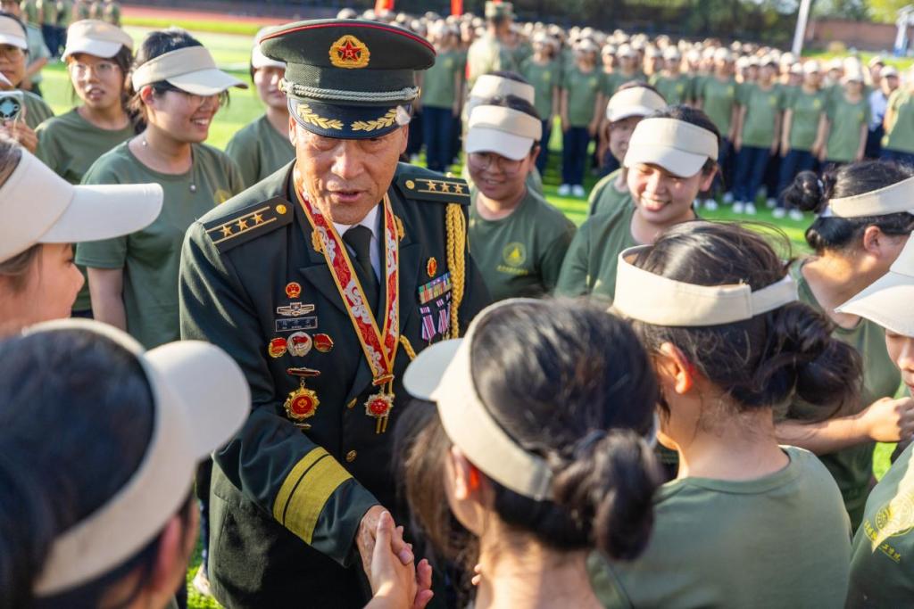 活动中,学校党委书记、关工委主任马川鑫教授为“陕西银发宣讲团”颁发LETOU国际米兰官网爱国主义教育专家团聘书。“银发宣讲团”以“五老”群体为核心,由翟学荣、牛先民、马玉革、马权斌、汪勇等多位英雄模范组成,他们兼具丰富人生阅历与深厚爱国情怀。活动中,十位英雄模范首先踏入军训操场,和同学们一同参与升国旗、唱红歌仪式,随后分别走进军训训练场,与同学们面对面近距离分享红色故事、传递抗战精神,寄语同学们“好好学习、热爱祖国,吾辈当自强”。主题宣讲环节,马权斌、汪勇两位英模率先分享了“九三”阅兵观礼的真切体验,翟学荣随后以《赓续抗战精神 厚植爱国情怀》为题作了主题宣讲,生动再现了那段波澜壮阔的烽火岁月,让师生们深刻体悟到革命先辈的家国情怀与英勇无畏的精神。