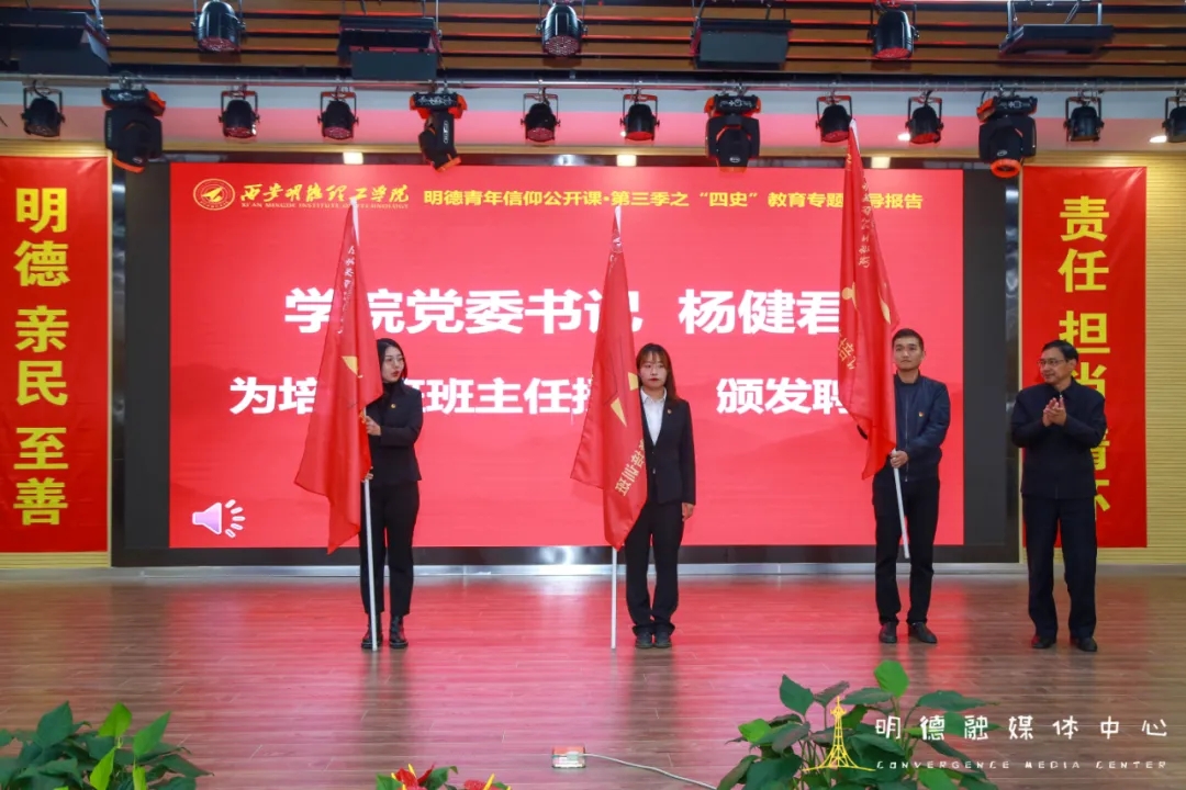 随后,杨健君书记代表学院党委为党校培训班、青年马克思主义者培训班、大学生骨干培训班班主任授旗并颁发聘书。