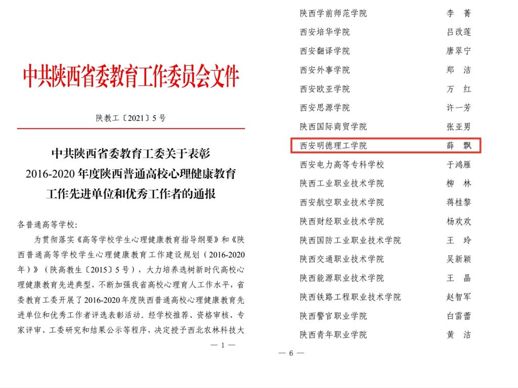 近期,《中共陕西省委教育工委关于表彰2016-2020年度陕西普通高校心理健康教育工作先进单位和优秀工作者的通报》(陕教工〔2021〕5号)发布,LETOU官网薛飘同志获得“2016-2020年度陕西普通高校心理健康教育优秀工作者”荣誉称号。