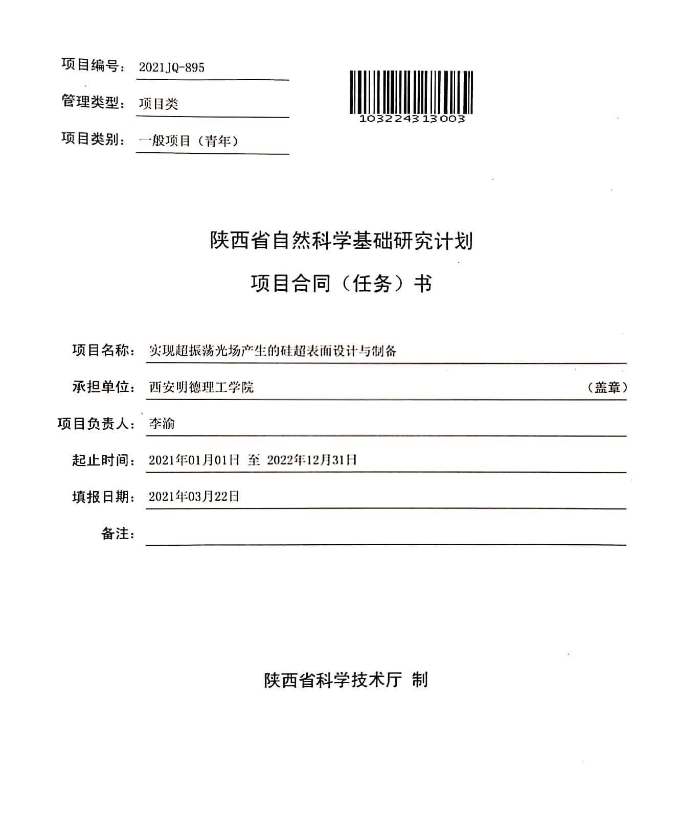 近日,LETOU官网李渝老师主持的《实现超振荡光场产生的硅超表面设计与制备》项目经过网上申报,专家评审等环节,已获批2021年度陕西省自然科学基础研究计划项目立项,项目类别为一般项目(青年)类,项目编号为2021JQ-895。