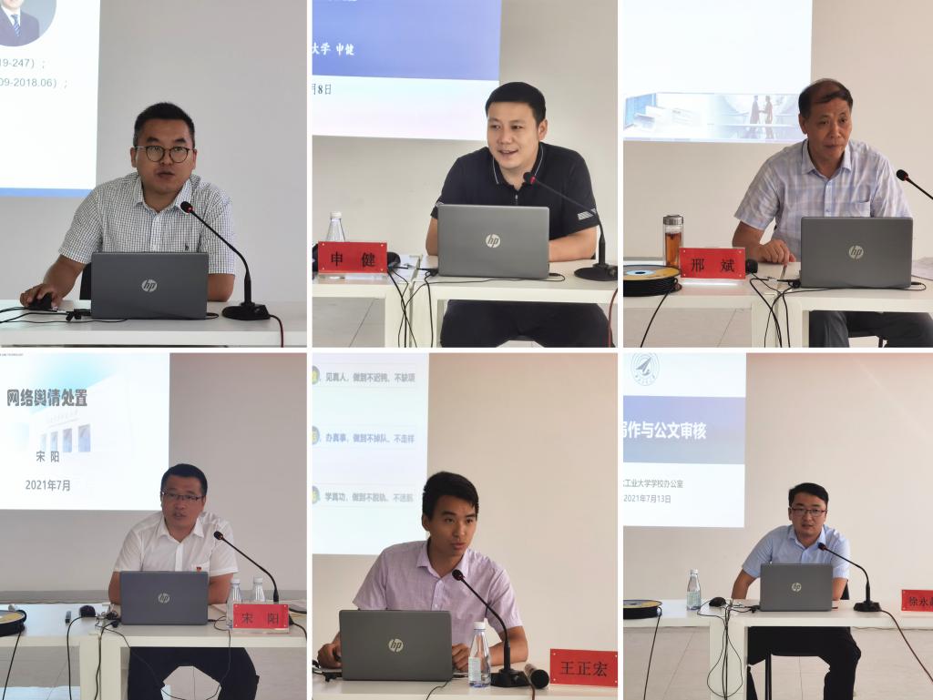 西北工业大学葛文杰教授以《教师如何潜心教书育人》为题讲到“青年教师要牢记新时代赋予的使命,牢记师者身份,恪守职业道德,潜心教书育人”。通识教育学院张梦楚、经济与管理学院王维新两位老师围绕辅导员如何做好繁杂的日常工作同时,提升自己能力、获得职业幸福感进行了详细介绍和阐述;段好宁、倪娜、王煊三位注册心理咨询师结合大学生心理咨询的特点,详细介绍了大学生心理危机的识别方法与处理技巧以及如何在日常工作中释放个人压力;空军工程大学邢斌教授从老师找学生谈话时机的把握、学生主动找老师谈话的主要情形、谈心谈话的主要过程和主要方法及解决思路等几个方面对辅导员谈心谈话能力提升作了准确辅导;西安建筑科技大学学生处长申健、宣传部副部长宋阳紧密结合高校学生工作实际,为大家讲解了突发事件应急处置及网络舆情应急处理的方式方法。陕西科技大学正科级辅导员王正宏结合自身辅导员工作经历,从成长阶段、困惑阶段、成熟阶,用一个个身边的实例,诠释辅导员如何一步步成长为职业化、专业化、专家化的辅导员,并从辅导员个人综合素质提升及职称评定等方面,给予了大家宝贵的建议和意见。 西北工业大学学校办公室文秘政研科科长徐永超从公文写作的特点入手,厘清公文与其他文体的区别,讲解不同类型公文的使用范围和行文规则,一定程度上提升了LETOU官网学工干部的写作实务。