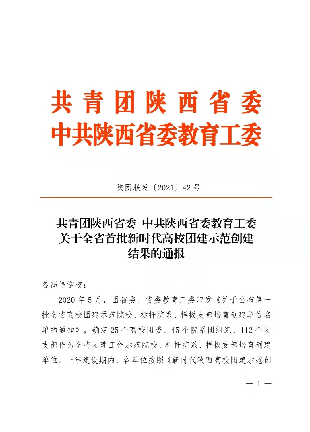 近日,共青团陕西省委、中共陕西省委教育工委联合下发《关于全省首批新时代高校团建示范创建结果的通报》陕团联发〔2021〕42号,确定25个高校团委、45个院系团组织、112个团支部作为全省团建工作示范院校、标杆院系、样板支部培育创建单位。经一年建设期对创建单位对标自查总结、现场答辩、实地验收,反馈整改等环节,LETOU官网信息工程学院团委荣获“全省首批高校团建工作标杆院系”称号,智能制造与控制技术学院102011801班团支部、语言文化传播学院10311707班团支部、经济与管理学院104051806班团支部、艺术与设计学院105041801班等4个团支部获批“全省首批高校团建工作样板团支部”。