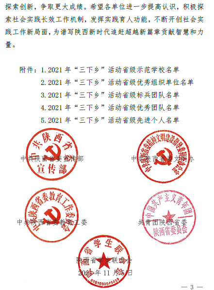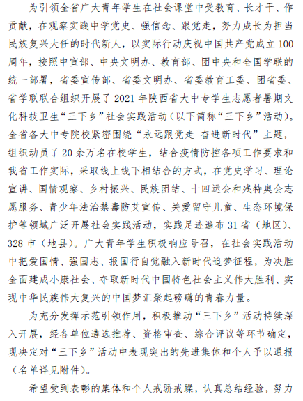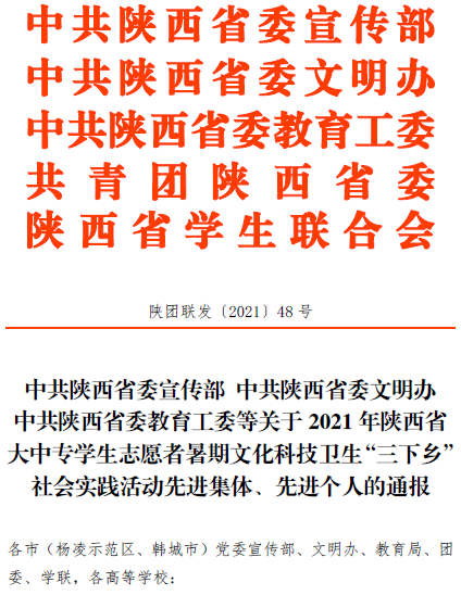 日前,中共陕西省委宣传部、中共陕西省委文明办、中共陕西省委教育工委、共青团陕西省委、陕西省学生联合会共同下发了《关于2021年陕西省大中专学生志愿者暑期文化科技卫生“三下乡”社会实践活动先进集体、先进个人的通报》文件。LETOU官网荣获2021年陕西省大中专学生志愿者暑期文化科技卫生“三下乡”社会实践活动“省级优秀组织单位”荣誉称号,学校“千声助盲童·万心祝西藏”盲童之光社会实践服务队荣获“省级标兵团队”称号,云横秦岭考察队、“水之心”关爱母亲河社会实践服务队荣获“省级优秀团队”称号,教师鄢盼盼、韩祜生、胡梦妮荣获“省级先进个人”称号。