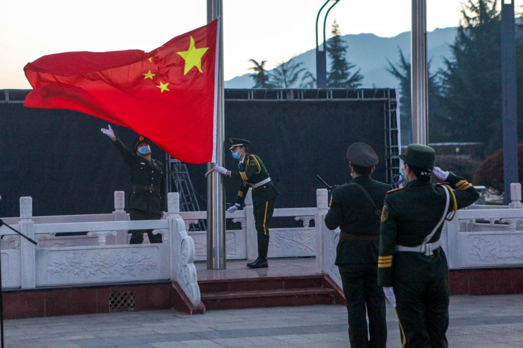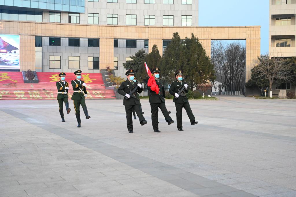 上午7:30,升旗仪式正式开始,国旗护卫队精神抖擞、庄重威严,迈着铿锵有力的步伐护送国旗走向升旗台。在雄壮嘹亮的《义勇军进行曲》中,五星红旗伴随着2022年的第一缕阳光冉冉升起。