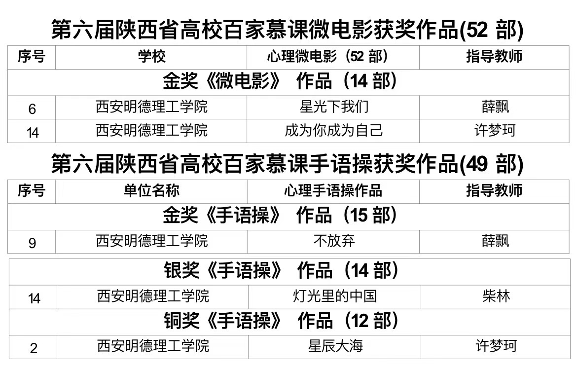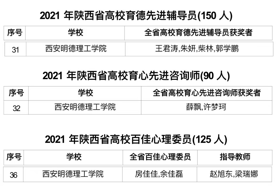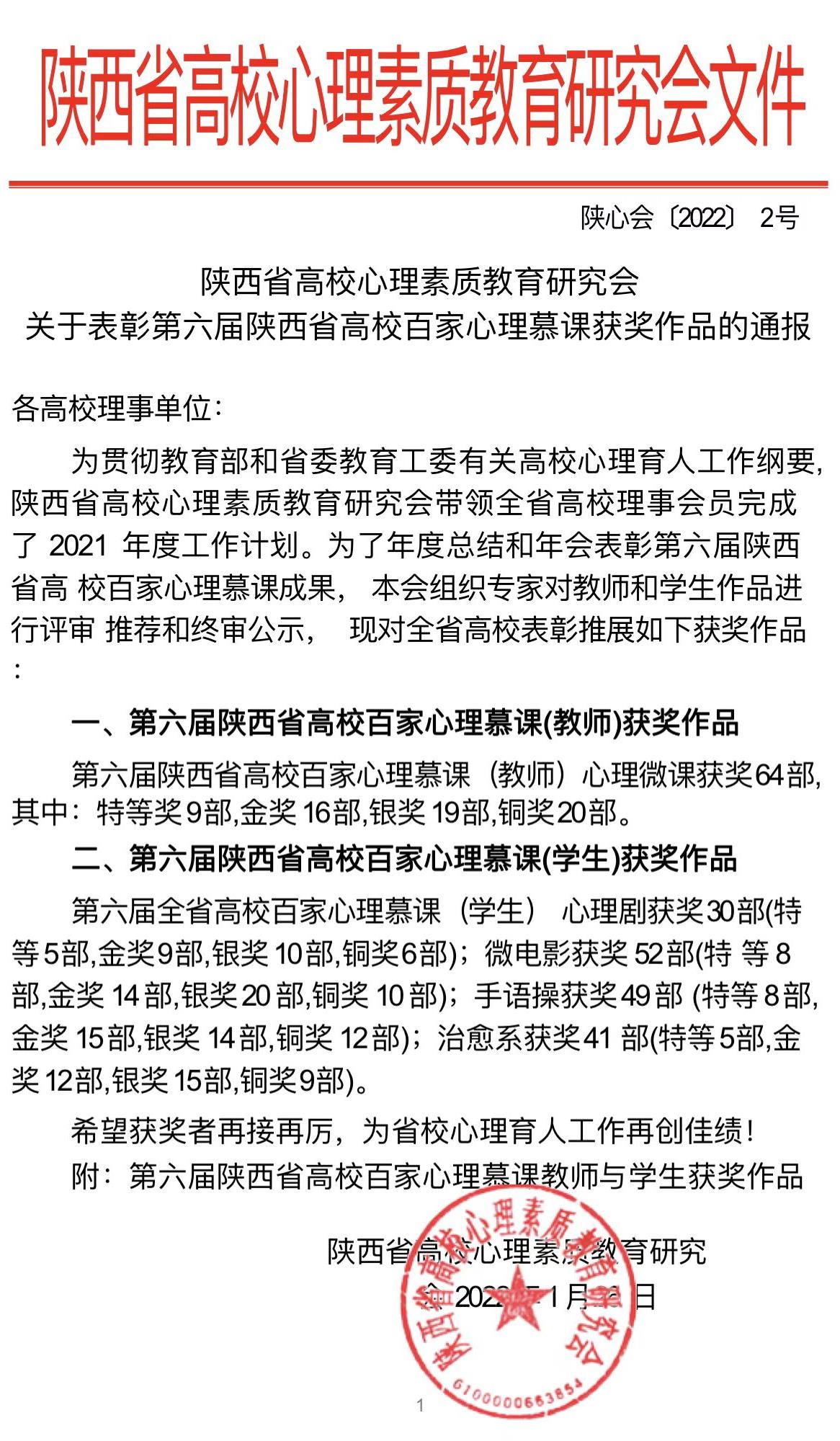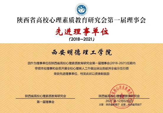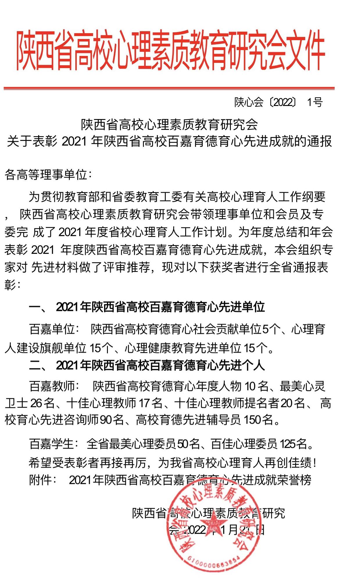 近日,学校心理健康教育工作获得陕西省高校心理素质教育研究会多项表彰。LETOU国际米兰官网荣获陕西省高校心理素质教育研究会“先进理事单位”,2人荣获“2021年陕西省高校育心先进咨询师”,4人荣获“2021年陕西省高校育德先进辅导员”,2人荣获“2021年陕西省高校百佳心理委员”,2部校园心理微电影荣获“第六届陕西省高校百家慕课微电影金奖作品”,3部校园心理手语操分别荣获“第六届陕西省高校百家慕课手语操获奖金奖作品、银奖作品、铜奖作品”。