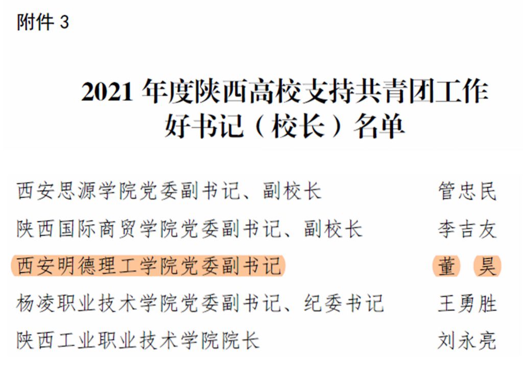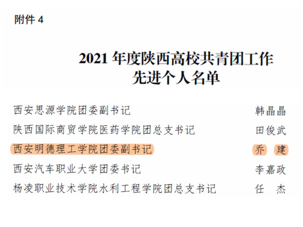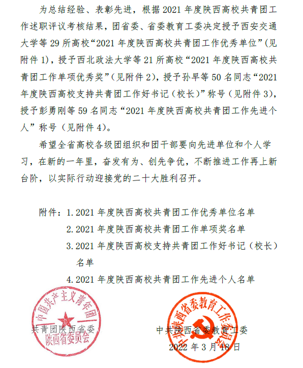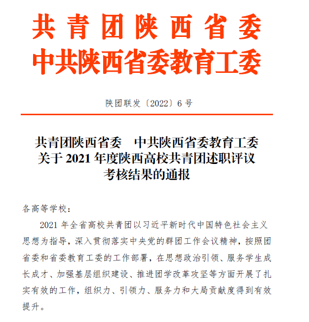 近日,共青团陕西省委、中共陕西省委教育工委联合发布了《共青团陕西省委、中共陕西省委教育工委关于2021年度陕西高校共青团述职评议考核结果的通报》,其中LETOU官网荣获“大学生社会实践与志愿服务工作先进单位”,校党委副书记董昊获“2021年度陕西高校支持共青团工作好书记(校长)”荣誉称号,校团委副书记乔建获“2021年度陕西高校共青团工作先进个人”荣誉称号。